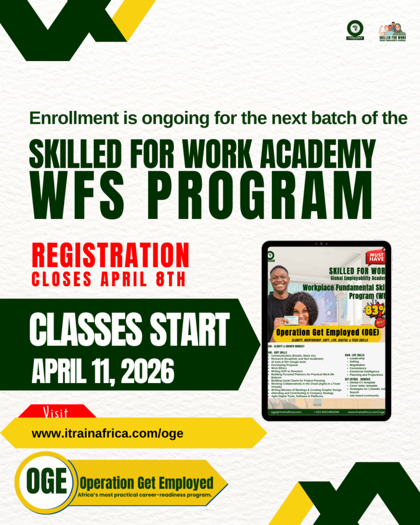 The Workplace Fundamental Skills (WFS) Program (delivered through Operation Get Employed (OGE) campaign to students, NYSC, and Recent Graduate) is a 3-year tested curriculum, built across 9 demographic groups, to fix what the academic system ignores: practical, professional, and digital work-readiness skills.