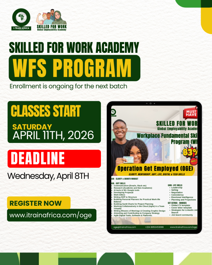 The Workplace Fundamental Skills (WFS) Program (delivered through Operation Get Employed (OGE) campaign to students, NYSC, and Recent Graduate) is a 3-year tested curriculum, built across 9 demographic groups, to fix what the academic system ignores: practical, professional, and digital work-readiness skills.