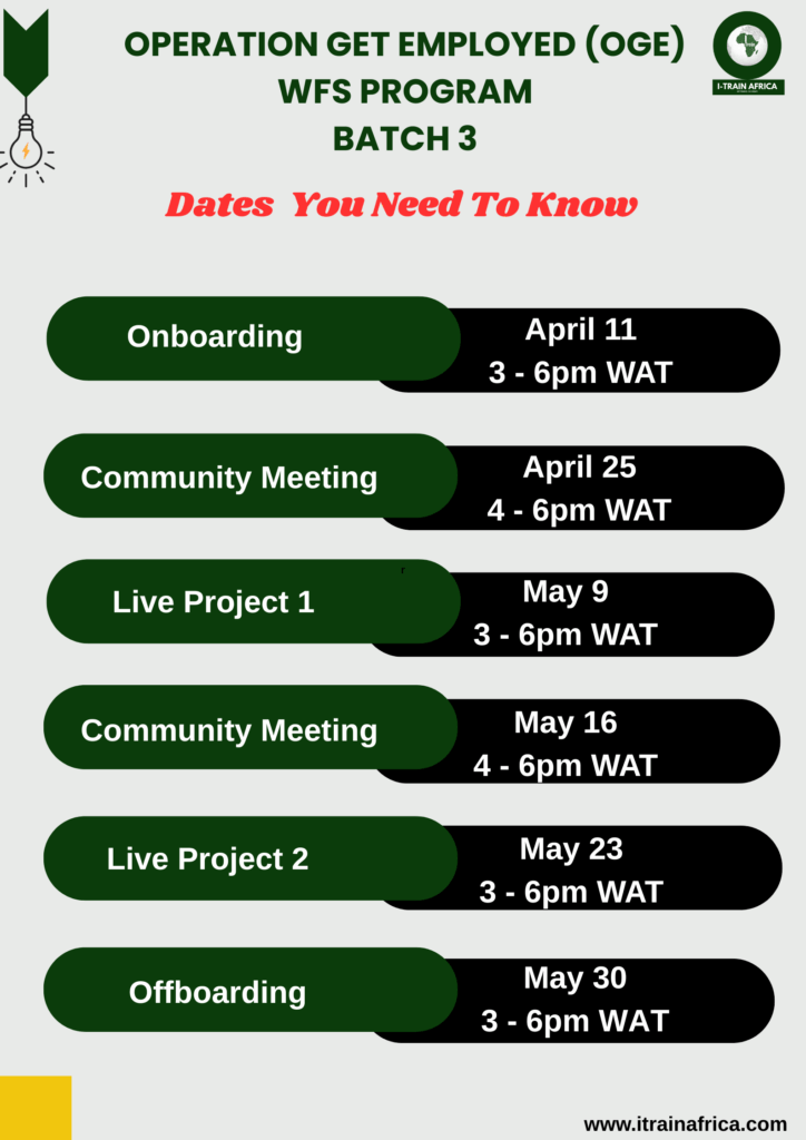 Operation Get Employed is a 6-week program designed for undergraduates and recent graduates/NYSC members to gain career clarity, workplace skills, and remote work skills.