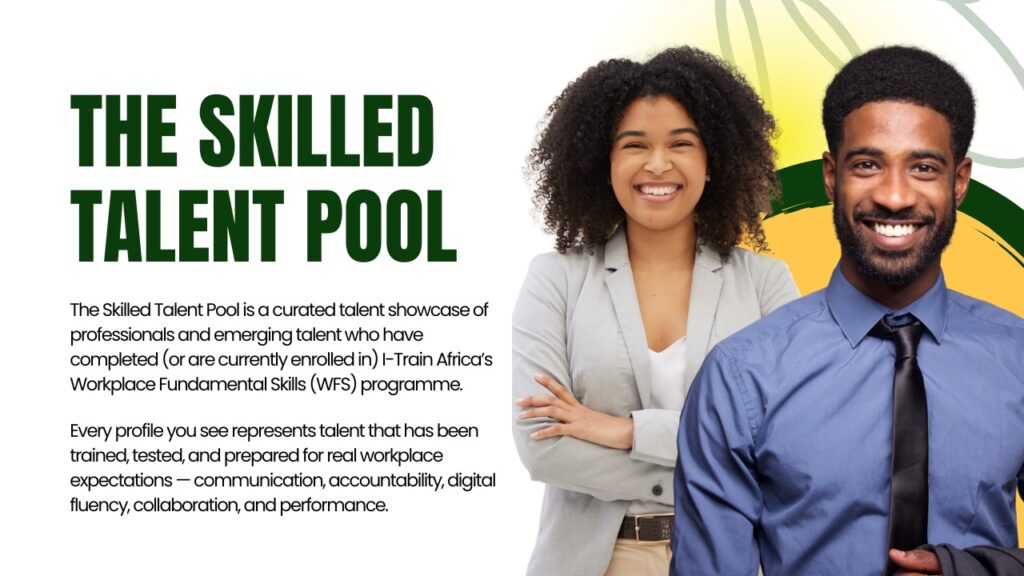 The Skilled Talent Pool is a curated talent showcase of professionals and emerging talent who have completed (or are currently enrolled in) I-Train Africa’s Workplace Fundamental Skills (WFS) programme. Every profile you see represents talent that has been trained, tested, and prepared for real workplace expectations — communication, accountability, digital fluency, collaboration, and performance.
