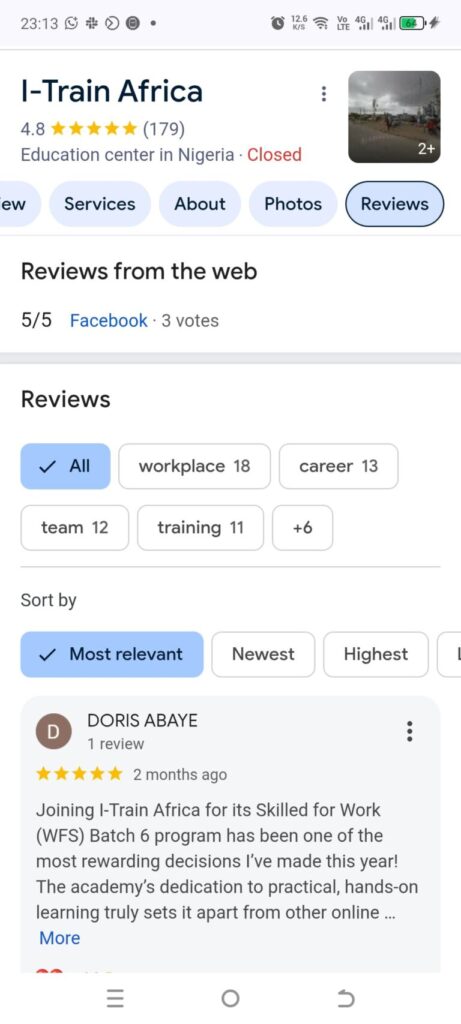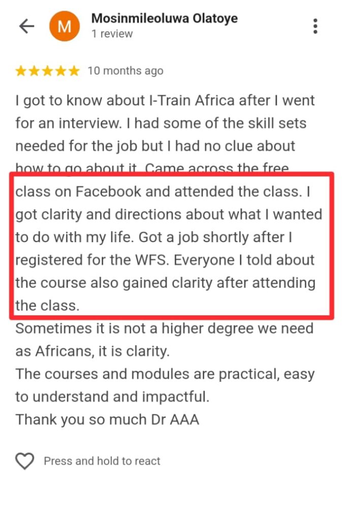“It’s a place of self-realization and development. A place to gain values for relevance. I recommend I-Train Africa”